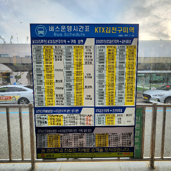 간혹 버스를 기다리다 보면 예정된 버스 시간이 지나도 김천구미역에서 구미방면 버스가 제시간에 오지 않아 당황할 수 있는데 위 시간표에서 몇분정도 여유를 가지고 기다려야 합니다.
